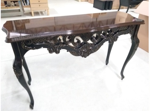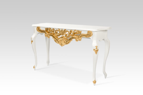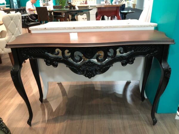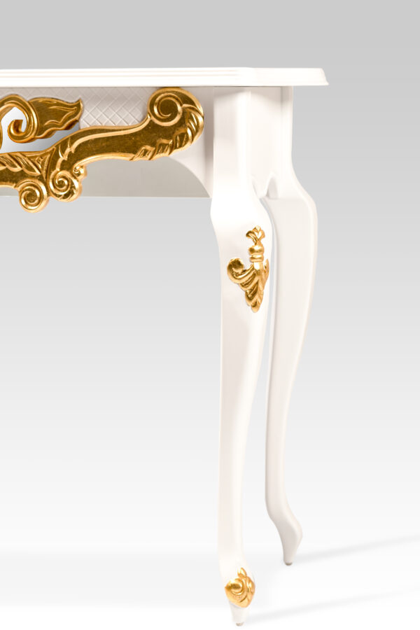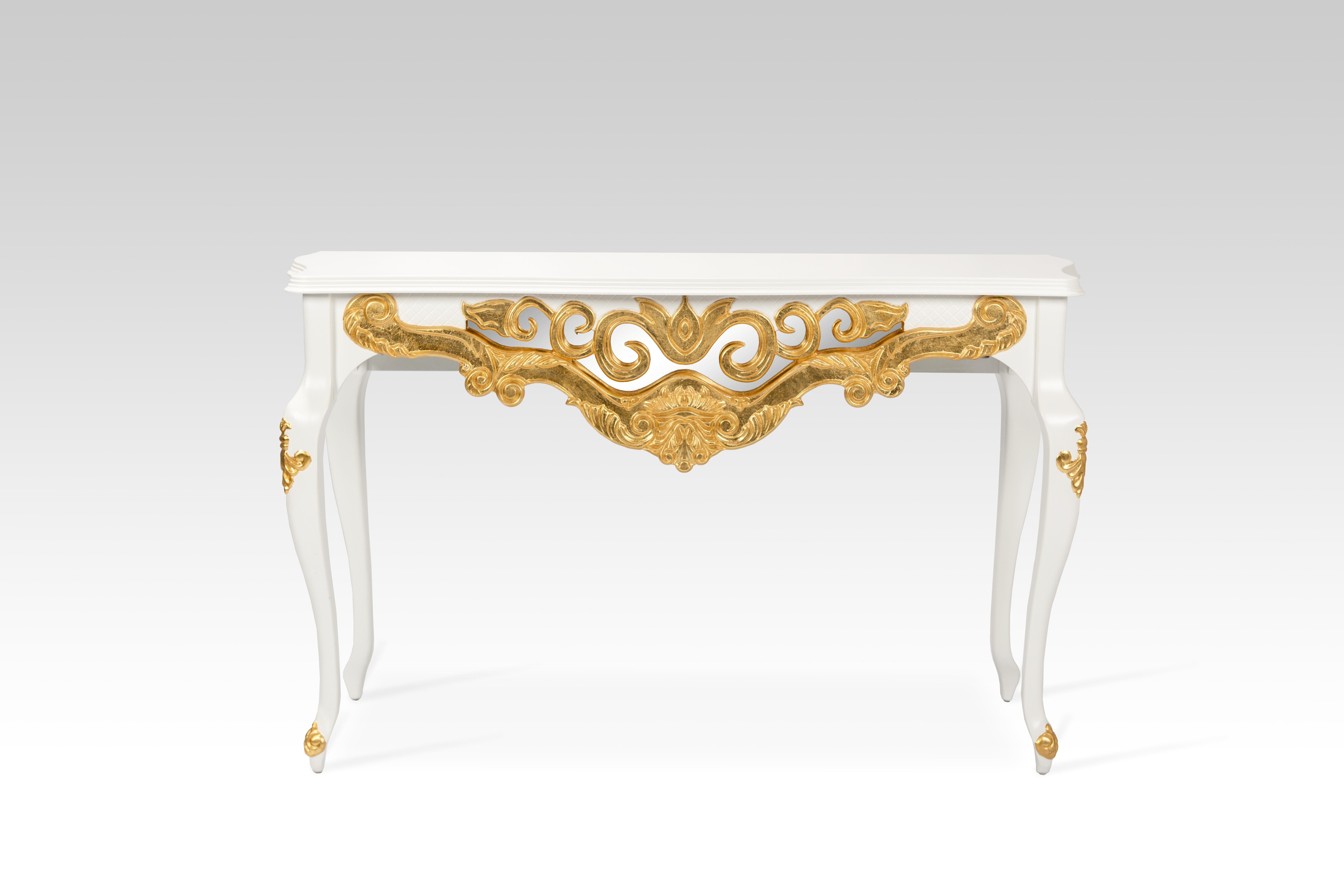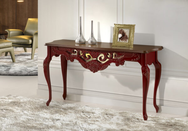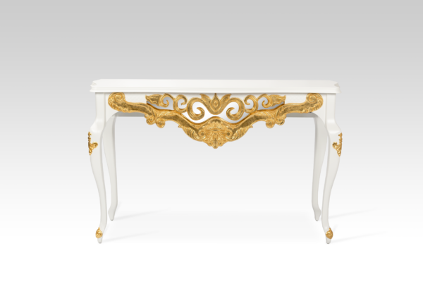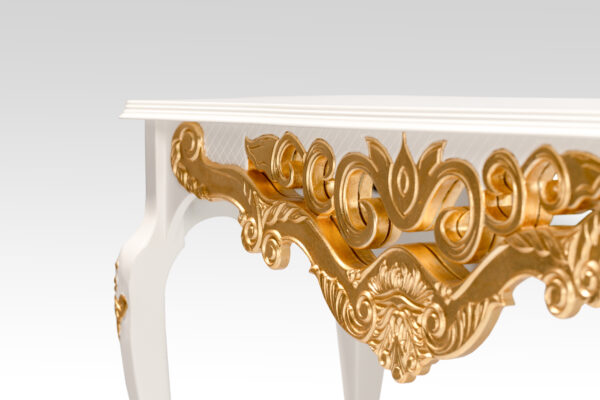 Feito em madeira maciça e MDF ultra, nos pés apresenta entalhes feitos à mão individualmente por artesão entalhador. O painel frontal ricamente entalhado apresenta um fundo com espelho, que além de muito charmoso, confere profundidade ao ambiente. Opção de entalhes ou todo no acabamento folha a ouro.