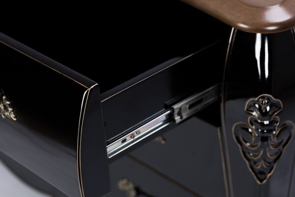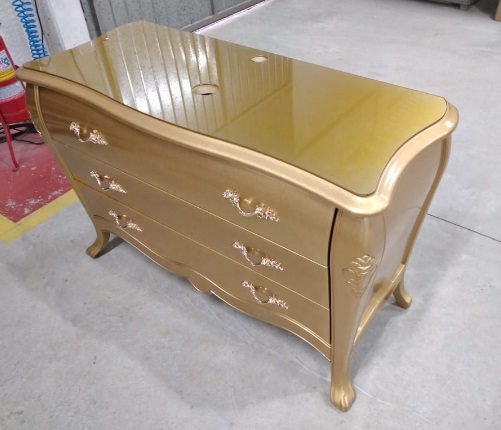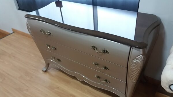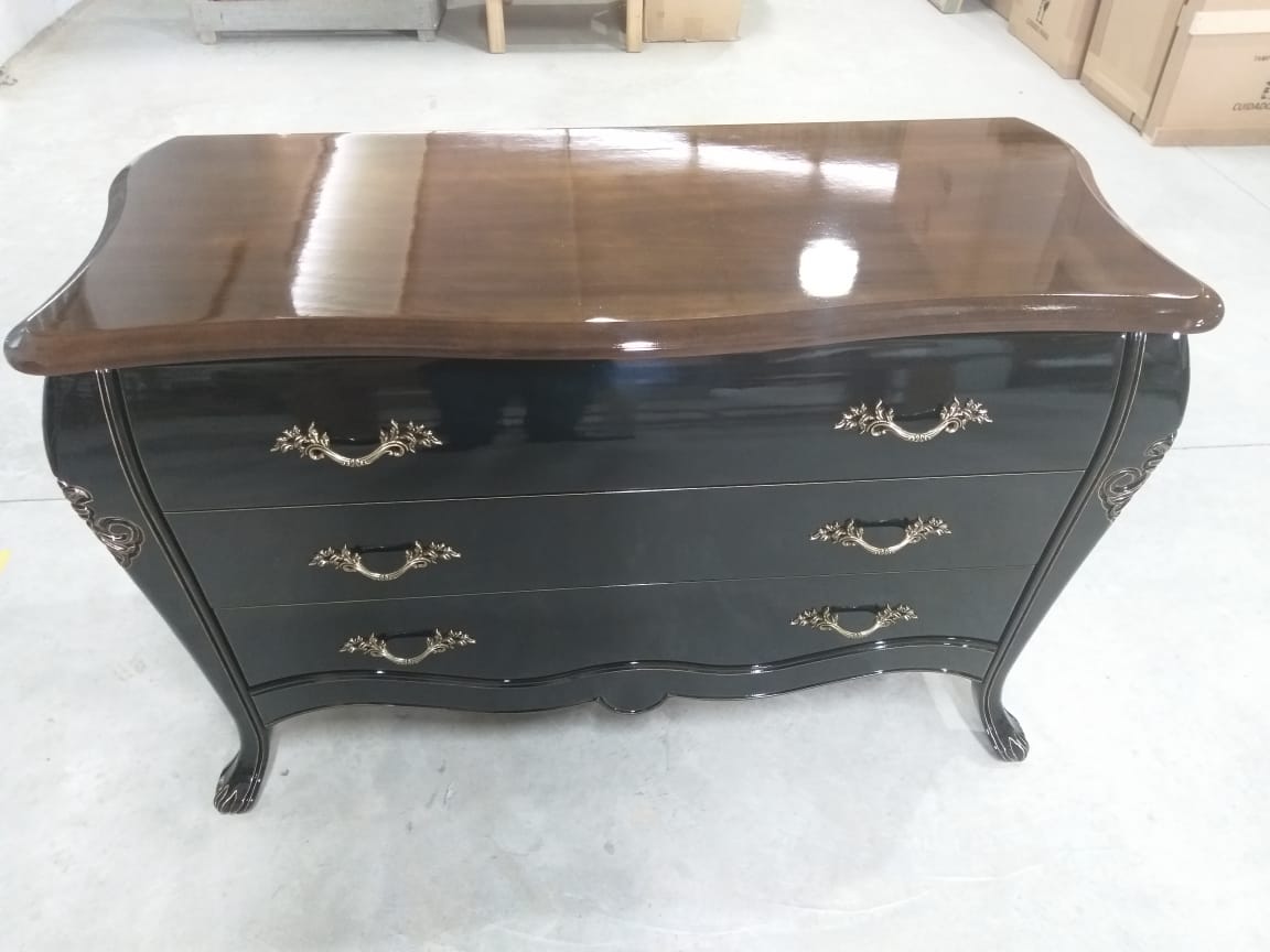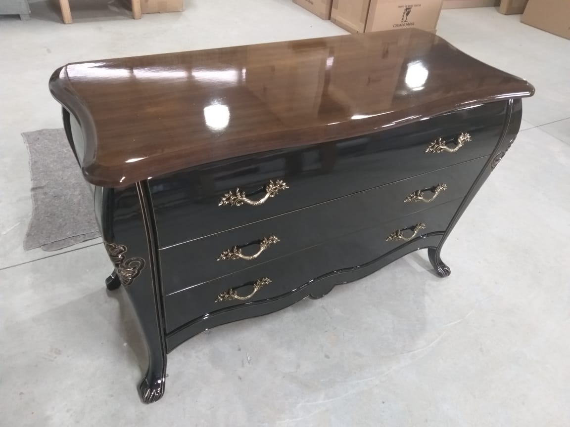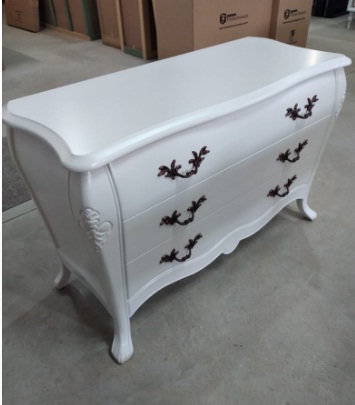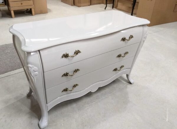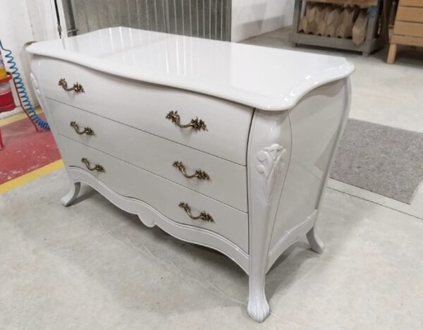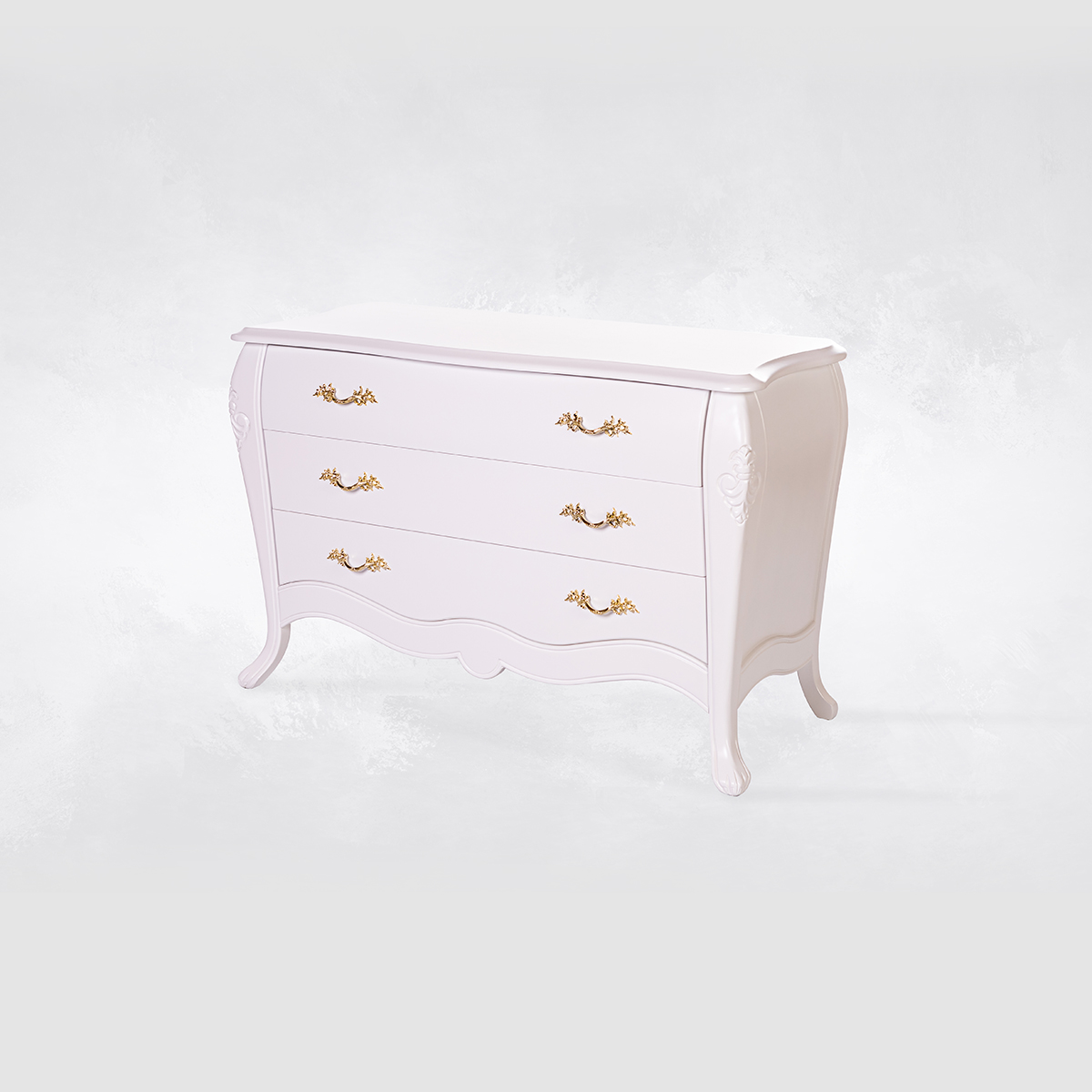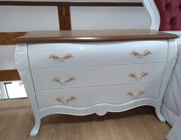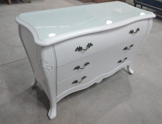 A Cômoda Gênova é elaborada com MDF Ultra e Madeira Maciça de Pinheiro Americano quando em acabamento em laca, ou totalmente em madeira maciça de Marupa ou Caxeta quando em acabamento amadeirado, ambos provenientes de fontes renováveis, com corrediças telescópicas, fixadores bi cromatizados, linha de puxadores de altíssima qualidade, acabamento em todas as cores Sayerlack, inclusive amadeirados. Com opção de entalhes feitos individualmente a mão nos pés frontais, ou lisos, com tampo de vidro incolor, marmorado ou pintado em todas as cores.