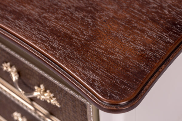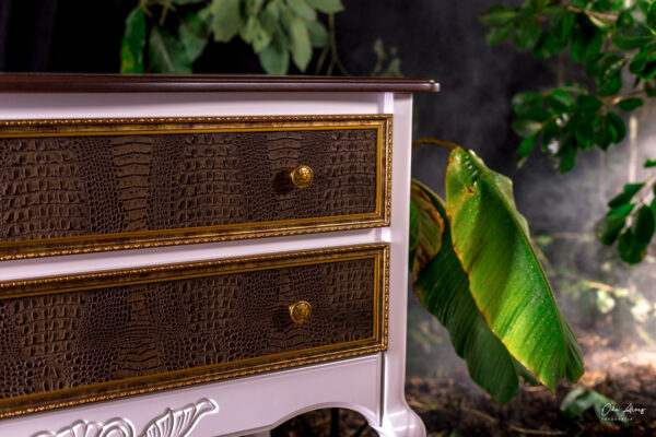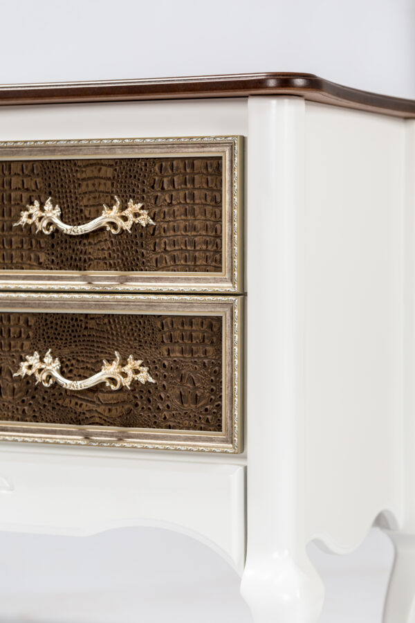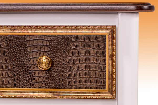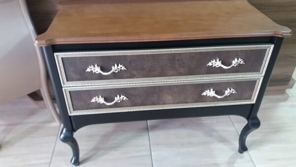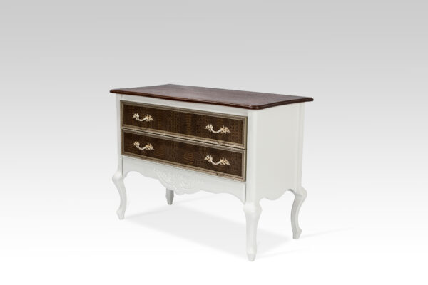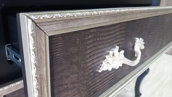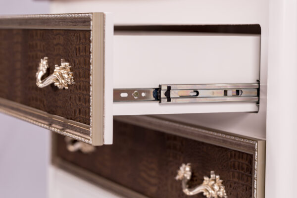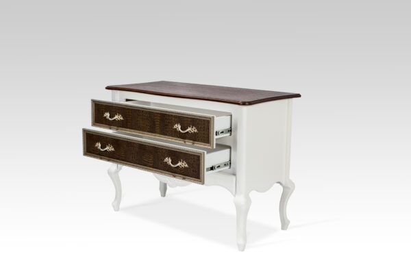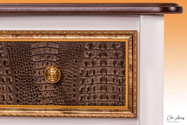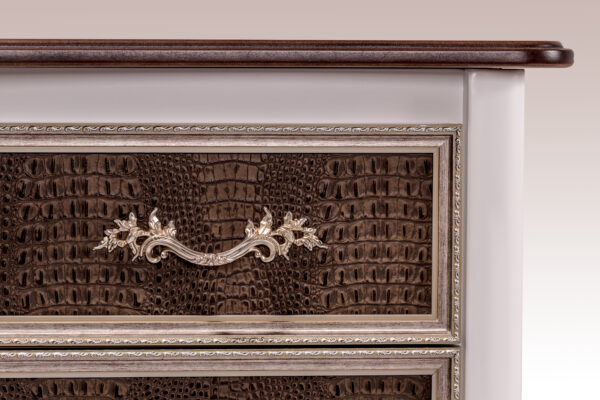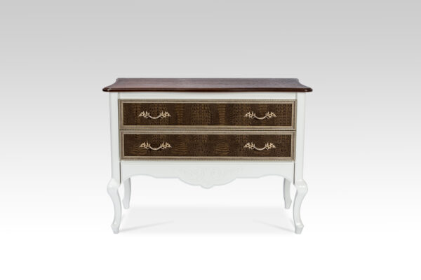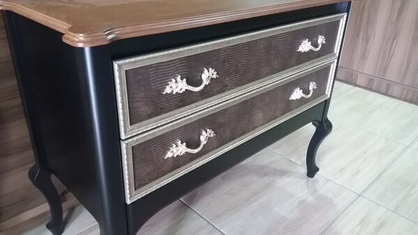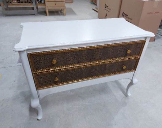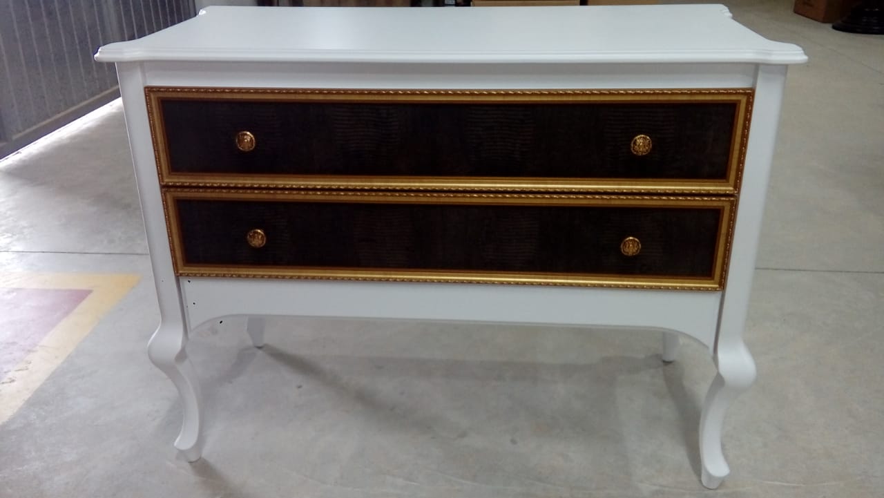A Cômoda Verona com Recouro emprega a importância do uso racional das matérias primas, elaborada com MDF Ultra e Madeira Maciça de Pinheiro Americano, ambos provenientes de fontes renováveis e uso do recouro, que é um produto ecologicamente correto, pois se utiliza das aparas e outras sobras do processo do couro, evitando ao máximo o desperdício e impactos ambientais. Com design contemporâneo mais sem esquecer sua herança clássica, com corrediças telescópicas, fixadores bi cromatizados, linha de puxadores de altíssima qualidade, acabamento em todas as cores em laca Sayerlack ao ainda em tons madeirados. O tampo pode receber vidro incolor ou pintado e ainda madeirado texturizado.