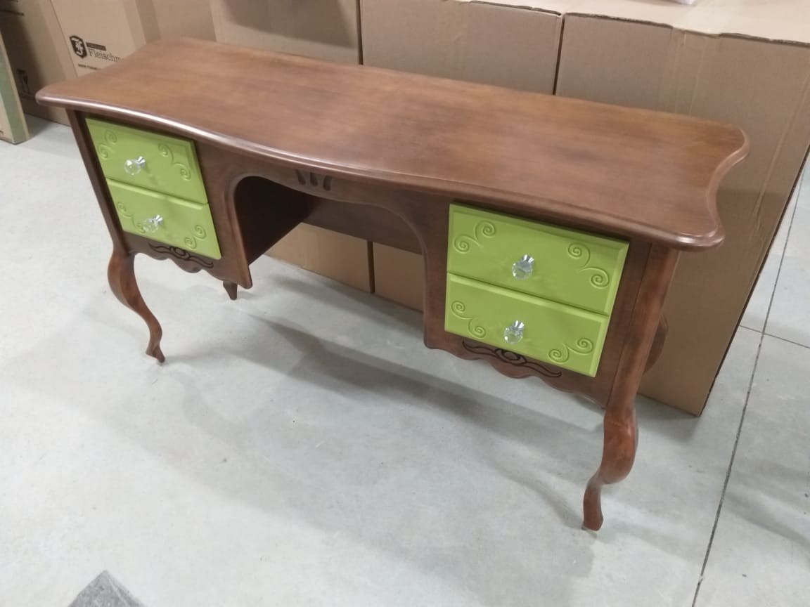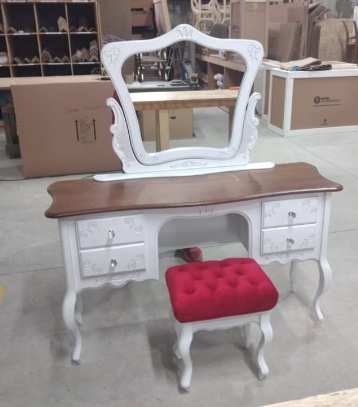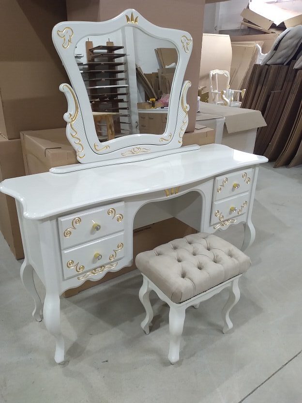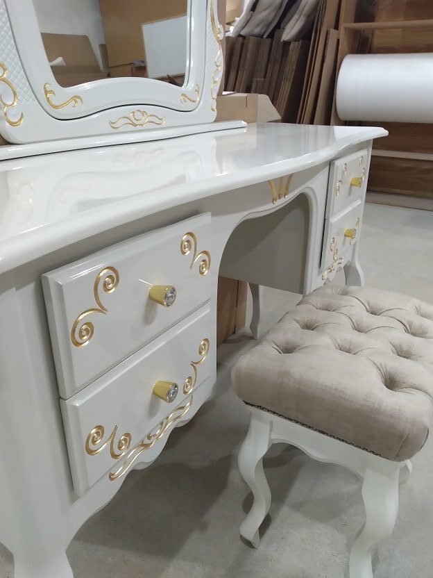 Produzida em madeira macica e mdf Ultra, disponível em todas as cores, tecidos e puxadores. Banco e espelho inclusos.